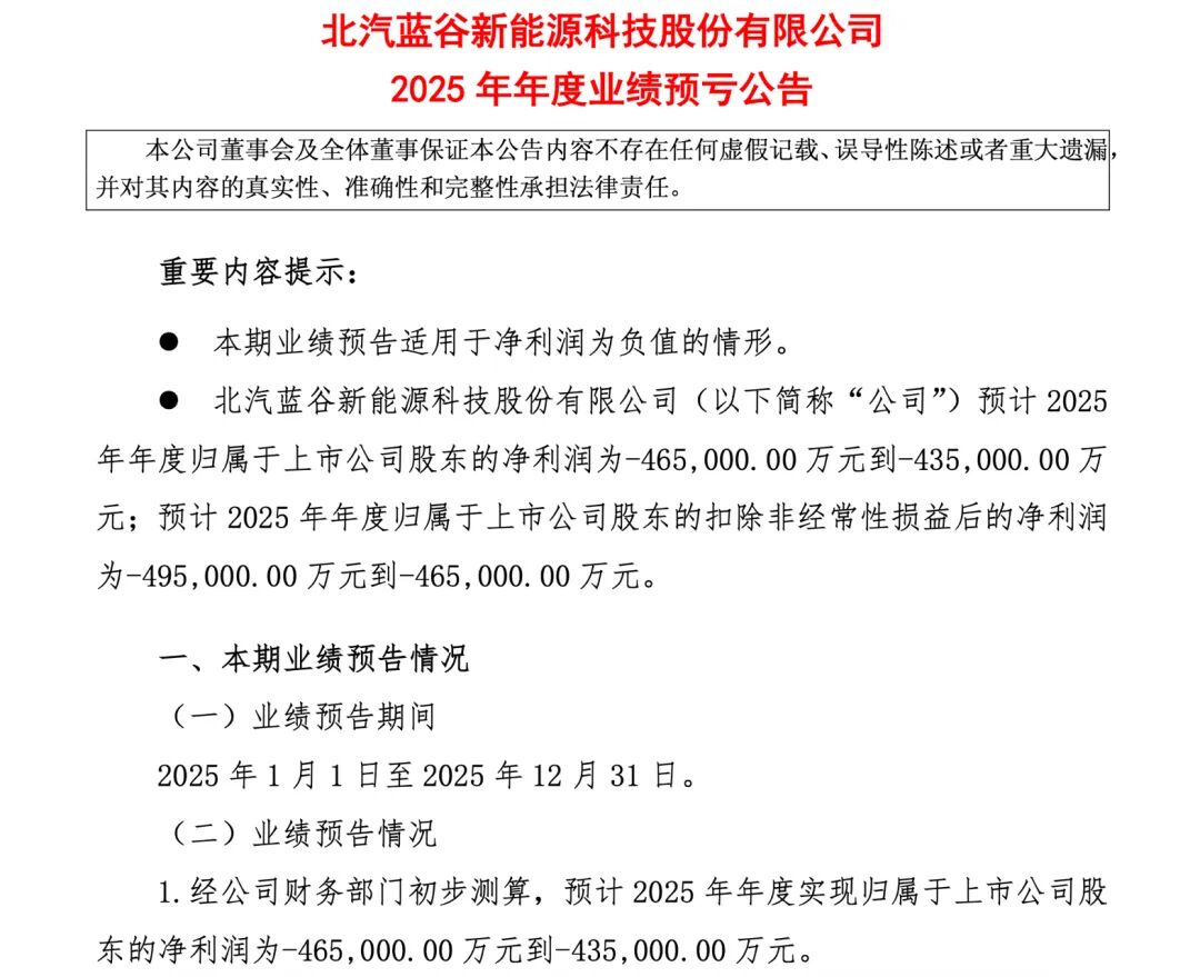 根据预告,去年全年,北汽蓝谷预计全年归母净利润亏损区间为43.5亿元至46.5亿元。相较于2024年的69.48亿元亏损显著收窄,预计减亏22.98亿元—25.98亿元,减亏幅度达33.09%—37.41%。