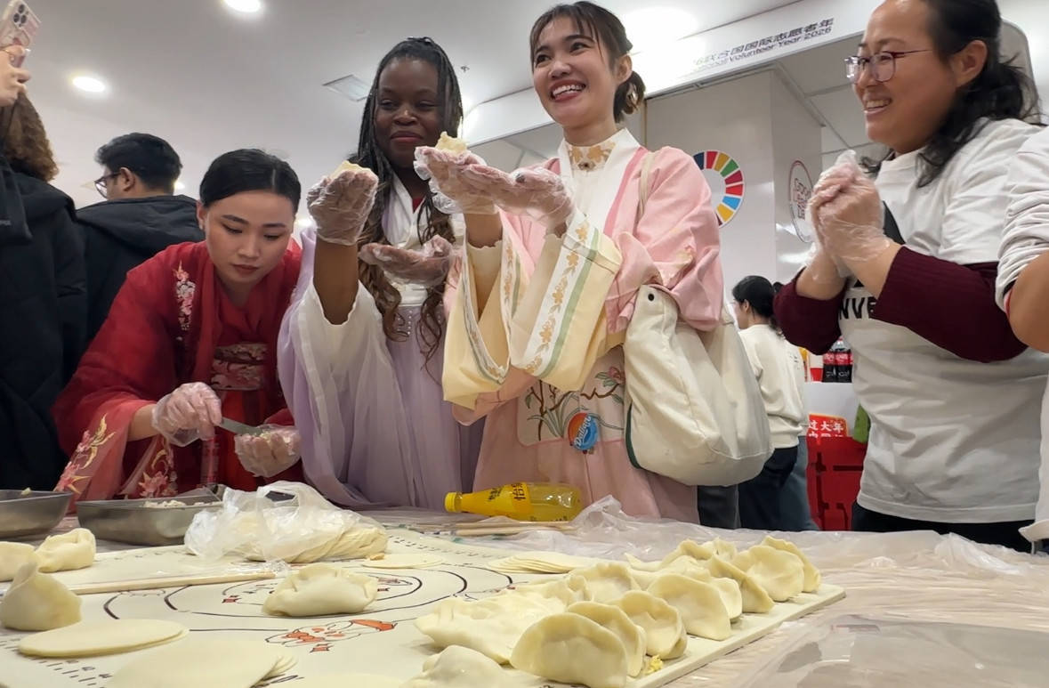 现场准备了灶糖、炸元宵、花生、瓜子、糖果等传统年节食品,而最受欢迎的还是亲手包饺子环节。在专业厨师的耐心指导下,国际学生们兴致勃勃地学习包饺子,现场充满欢声笑语。尽管包出的饺子形状不一,但大家的参与热情却丝毫未减。香菇白菜胡萝卜馅、角瓜鸡蛋馅的饺子陆续出锅,大家围坐品尝,聊着家乡与大连的故事。国际学生在揉面、擀皮、包馅的过程中,了解“小年吃饺子”的民俗寓意,亲口品尝“团圆”与“祈福”的年味儿,在烟火气中读懂中国春节的文化内涵,感受大连这座城市的温情与善意。